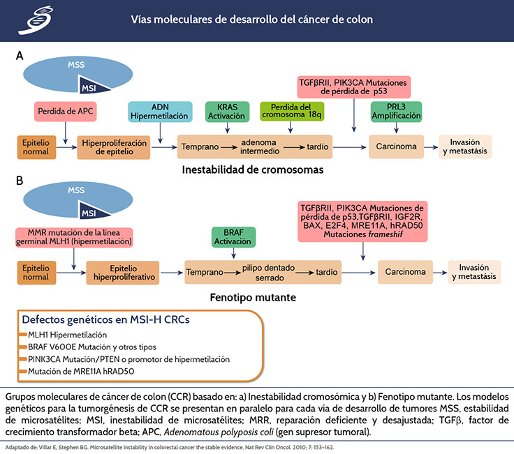 Los estudios moleculares de la CCR han dilucidado que varias vías de señalización están involucradas en su desarrollo. Ahora tenemos una idea bastante detallada de los principales eventos genéticos involucrados en la carcinogénesis colorrectal. La heterogeneidad morfológica, en términos de sitio, grado y tipo del tumor, se ha ampliado por complejidad molecular , identificándose vías moleculares que actúan en el desarrollo de la neoplasia, como se observa en la imagen siguiente.