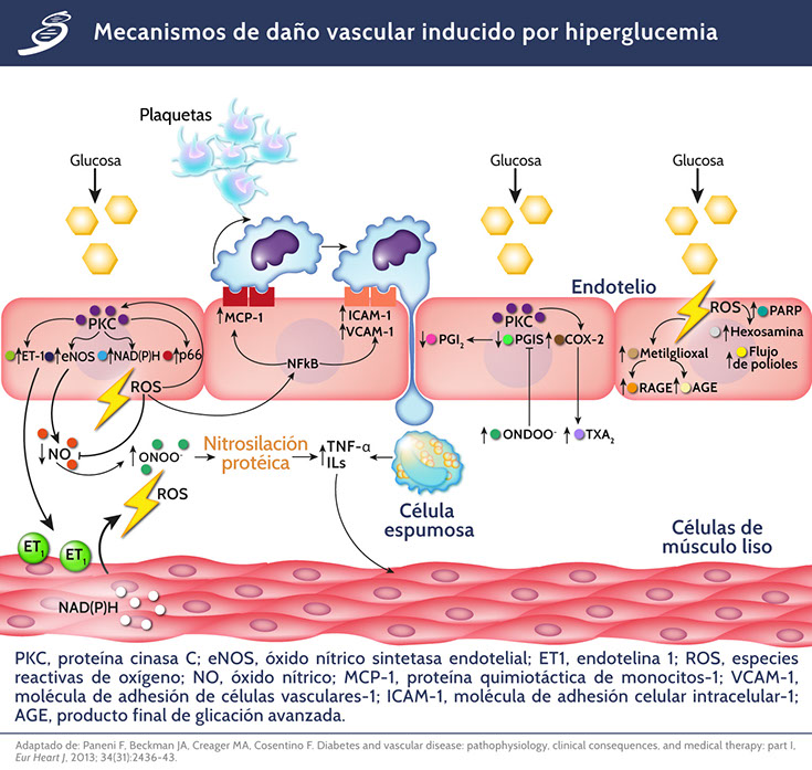 Las altas concentraciones de glucosa intracelular conducen a la activación de la proteína cinasa C (PKC) y posterior producción de ROS por nicotinamida adenina dinucleótido fosfato (NADPH) oxidasa y la proteína adaptadora p66Shc. El aumento del estrés oxidativo inactiva rápidamente el NO que conduce a la formación del ONOO- pro-oxidante, responsable de la nitrosilación de proteínas. La disponibilidad reducida de NO también se debe a la disregulación de eNOS dependiente de PKC. De hecho, la PKC desencadena una regulación al alza de enzimas que mejoran el desacoplamiento de eNOS y conduce a una mayor acumulación de radicales libres. Por otro lado, la hiperglucemia reduce la actividad de eNOS que entorpece la fosforilación activadora en Ser1177. Junto con la falta de NO, la activación de PKC inducida por la glucosa provoca una síntesis aumentada de ET-1 que favorece la vasoconstricción y la agregación plaquetaria. La acumulación de anión superóxido también desencadena la regulación positiva de los genes proinflamatorios: proteína quimiotáctica de monocitos-1 (MCP-1), molécula de adhesión de células vasculares-1 (VCAM-1) y molécula de adhesión celular intracelular-1 (ICAM-1) a través de la activación de la señalización del factor nuclear kappa-beta (NF-kB). Estos eventos conducen a la adhesión de los monocitos, movimiento y diapédesis con la formación de células espumosas en la capa subendotelial. Las citocinas inflamatorias derivadas de células espumosas mantienen la inflamación vascular, así como la proliferación de células del músculo liso, acelerando el proceso aterosclerótico. La disfunción endotelial en la diabetes también se deriva del aumento de la síntesis de tromboxano A2 (TXA2) a través de la regulación positiva de cicloxigenasa 2 (COX-2) y la inactivación de prostaciclinas (PGI2) mediante una mayor nitrosilación. Además, las ROS aumentan la síntesis del metabolito de la glucosa metilglioxal, lo que conduce a la activación de la señalización de los productos finales de la glicación avanzada/receptor para productos finales de glicosilación avanzada (AGE/RAGE) y del flujo pro-oxidante de la hexosamina y la vía de los polioles (véase imagen previa).