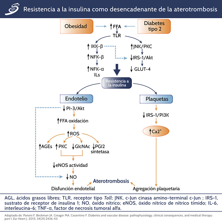 La hiperglucemia crónica y la resistencia a la insulina determinan una alteración significativa en los factores de coagulación, así como una mayor agregación plaquetaria, lo que lleva a un estado protrombótico. El aumento inducido por la diabetes de los niveles de factor tisular, activan la trombina convirtiendo el fibrinógeno en fibrina. La fibrina organizada aumenta aún más debido a altos niveles de PAI-1 y de t-PA reducidos. El aumento del contenido de Ca++, la estimulación de la trombina y la interacción con el factor de von Willebrand (vWF) a través del receptor de la glucoproteína IIb/IIIa, la cual provoca cambios en la forma de las plaquetas, la liberación de sus gránulos y la agregación. La liberación de micropartículas del endotelio lesionado y las plaquetas circulantes contribuyen a acelerar el desarrollo de un trombo. La disfunción endotelial precipita la ruptura de la capa endotelial y conduce a la exposición del colágeno y vWF, activando las plaquetas y favoreciendo la trombosis vascular.