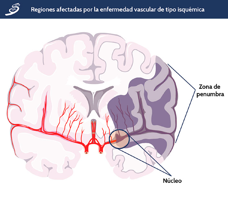 Disminución de la perfusión a cerebral <5% más de 5min, causa muerte celular por hipoxia, sin embargo, la magnitud del daño por etiología tromboembólica dependerá de la gravedad de la isquemia. Las regiones afectadas se pueden dividir para su análisis como el área del núcleo de la lesión y el tejido en la “penumbra” (como se muestra en la siguiente imagen). En el caso del núcleo, las células mueren a los pocos minutos ya que el flujo sanguíneo cerebral (FSC) es menor a 10mL/100g de tejido/minuto. La penumbra isquémica que puede permanecer viable por unas horas es la que recibe un FSC <25mL/100g de tejido/minuto por la perfusión marginal del tejido. Si el tejido cerebral no sufre aún un daño irreversible, si se restaura el flujo sanguíneo, puede reducir o revertir la lesión. El daño transcurre más rápido en hipertermina y más lento en hipotermia.