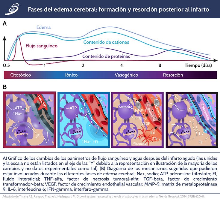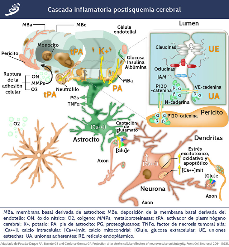 Además, la falla de la BHE por la vía de ROS permite extravasación de neutrófilos al tejido isquémico en respuesta a quimiocinas producidas por astrocitos, macrófagos y células de la microglía. Los mecanismos mediados por glutamato ya mencionados, excitotoxicidad vía NMDA y receptores AMPA que causan hiperestimulación neuronal e influjo de calcio con acumulación mitocondrial y en retículo endoplasmático, dispara la toxicidad dendrítica. Las respuestas neurovasculares son desencadenadas por los astrocitos, secundario también a la propagación de ondas de Ca++, promoviendo gliotransmisión homeostática. Los pericitos, por su parte, muestran uniones intercelulares deformadas y formación de vesículas pinocíticas que afectan la polarización astrocítica, detectado como la deposición defectuosa de membrana basal derivada de astrocito, su deposición en el endotelio es afectada por la falta de pericitos; así, las modificaciones en la organización molecular y la señalización intracelular de las proteínas de unión alteran la homeostasis vascular (como se observa en lo siguiente).