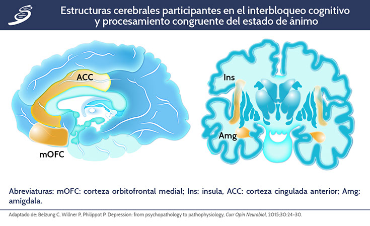 Otras evidencias han asociado el juicio emocional-congruente con áreas cerebrales adicionales incluyendo la amígdala, ínsula y la ACC, las cuales se encuentran disfuncionales en pacientes deprimidos, confirmando que la depresión está asociada con el funcionamiento alterado del sistema cerebral involucrado en el procesamiento congruente del estado de humor. En la siguiente imagen se aprecian las estructuras cerebrales involucradas en el mecanismo de interbloqueo cognitivo y procesamiento congruente del estado de ánimo.
