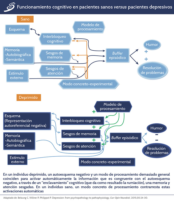 La información congruente con el esquema (esquema-congruente) activada en el buffer episódico aumenta la activación de esquemas depresivos mediante un circuito de retroalimentación, incrementando aún más el sesgo hacia el procesamiento de la información proveniente del esquema, es así que, la mente quedaría atrapada en un ciclo depresivo, completando y reforzando el patrón de dicha información negativa. En la siguiente imagen se aprecia un esquema representativo del funcionamiento cognitivo tanto en un individuo sano como en uno con depresión.