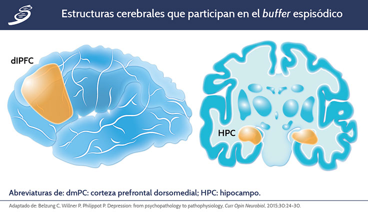 El buffer episódico se basa en dos áreas diferentes del cerebro: el hipocampo y la corteza prefrontal (PFC, por sus silgas en inglés), la PFC recibe e integra la información sensorial polimodal de las áreas corticales posteriores. Las estructuras cerebrales que se encuentran involucradas en el mecanismo de buffer episódico se observan en la siguiente imagen.