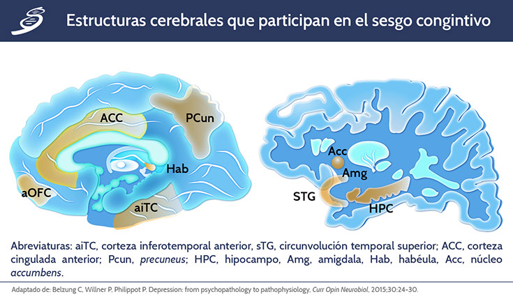 La habénula lateral (LHb, por sus siglas en inglés) puede ser una estructura subcortical clave en la generación de sesgos cognitivos negativos. La LHb codifica estados aversivos tales como la omisión de una recompensa esperada que lleva, por un lado, a un mayor procesamiento de información negativa por la amígdala y, por otro, a un procesamiento disminuido de información positiva por el núcleo accumbens, exhibiendo la LHb hiperactividad durante los estados de tipo depresivo. Los sesgos cognitivos negativos también pueden ser el resultado de la regulación descendente reducida, por ejemplo: en personas deprimidas, el procesamiento de palabras negativas se asocia con una mayor activación en el ACC rostral y precúneo, que probablemente se relaciona con mecanismos compensatorios, requiriéndose entonces de una mayor activación neuronal para lograr la inhibición de la regulación descendente (observar la imagen “Estructuras cerebrales que participan en el sesgo congintivo”).