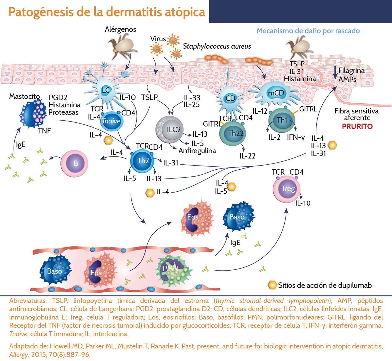 Un mecanismo por el que los defectos de la filagrina pueden influir en la inflamación, es mediante la liberación de citocinas derivadas de células epiteliales, incluidas la linfopoyetina tímica derivada del estroma (thymic stromal-derived lymphopoietin [TSLP]), IL-25 e IL-33, que se sabe están aumentadas en el contexto de AD. Se ha demostrado que la TSLP es una potente promotora de las respuestas de basófilos e ILC2 en la piel, mientras que IL-25 e IL-33 producen preferencialmente ILC2. Cabe destacar que, aunque la filagrina está fuertemente relacionada con la DA, en estudios con poblaciones de pacientes europeos se ha encontrado la mutación sólo en el 30% de los pacientes.