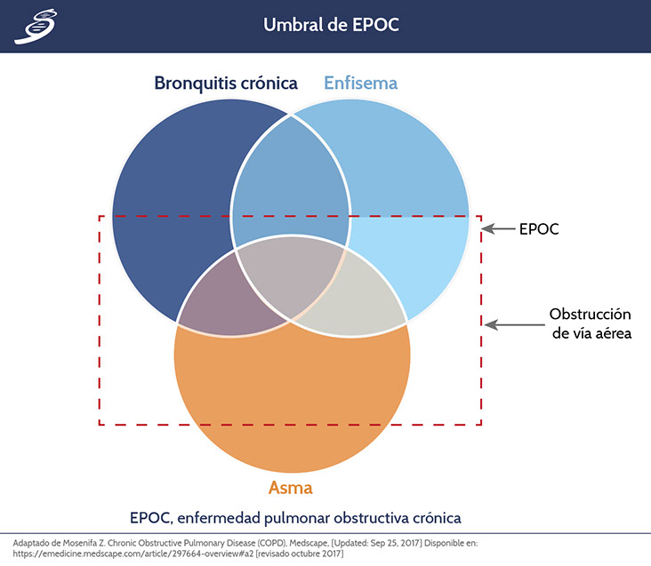 La enfermedad pulmonar obstructiva crónica (EPOC) es una patología inflamatotria del pulmón, especialmente localizada en vías respiratorias periféricas y el parénquima pulmonar, que aumenta durante las exacerbaciones agudas. También se asocia con inflamación sistémica, que puede contribuir al empeoraramiento de varias comorbilidades. Los principales cambios fisiopatológicos son: la remodelación y el estrechamiento de las vías respiratorias pequeñas, y destrucción del parénquima pulmonar con la subsecuente destrucción de las uniones alveolares. El Diagrama de Venn de la siguiente figura de EPOC, muestra cómo es una patología crónica en la cual, subconjuntos de pacientes pueden tener características dominantes de bronquitis crónica, enfisema o asma.
