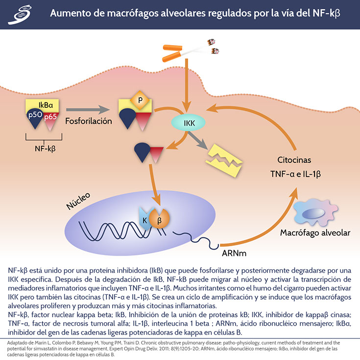 La mayoría de las proteínas inflamatorias, están reguladas por el factor de transcripción nuclear kappa beta (NF-kβ) (esquematizado en la siguiente imagen), por medio de retroalimentación positiva en los macrófagos alveolares, especialmente en exacerbaciones. De manera progresiva (más en fumadores) aumenta el número de macrófagos pulmonares por aumento en el reclutamiento de monocitos de la circulación en respuesta a quimiocinas selectivas de monocitos IL-2, IL-1.
