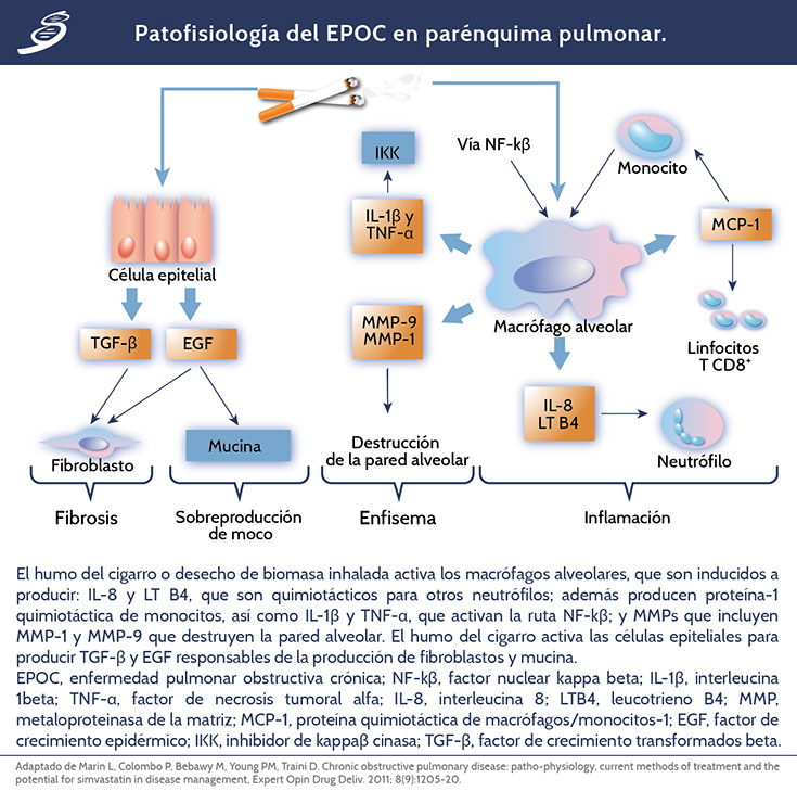 En pacientes con EPOC, los macrófagos están incrementados de 5 a 10 veces en la vía aérea; se localizan en sitios destruidos de la pared alveolar en enfisema, habiendo una correlación entre el número de macrófagos en el parénquima pulmonar y la severidad del enfisema. Los macrófagos se activan por humo de cigarro (más común), liberando mediadores inflamatorios como TNF-α, IL-1, IL-8, CCL2 (proteína quimiotáctica de monocitos 2), leucotrienos B4 (LT B4) y especies reactivas de oxígeno (ROS). También, secretan enzimas elastolíticas como metaloproteinasas de la matriz (MMP) 2, 9 y 12; así como catepsinas K, L y S. La enzima elastolítica secretada por los macrófagos alveolares que predomina es la MMP-9.