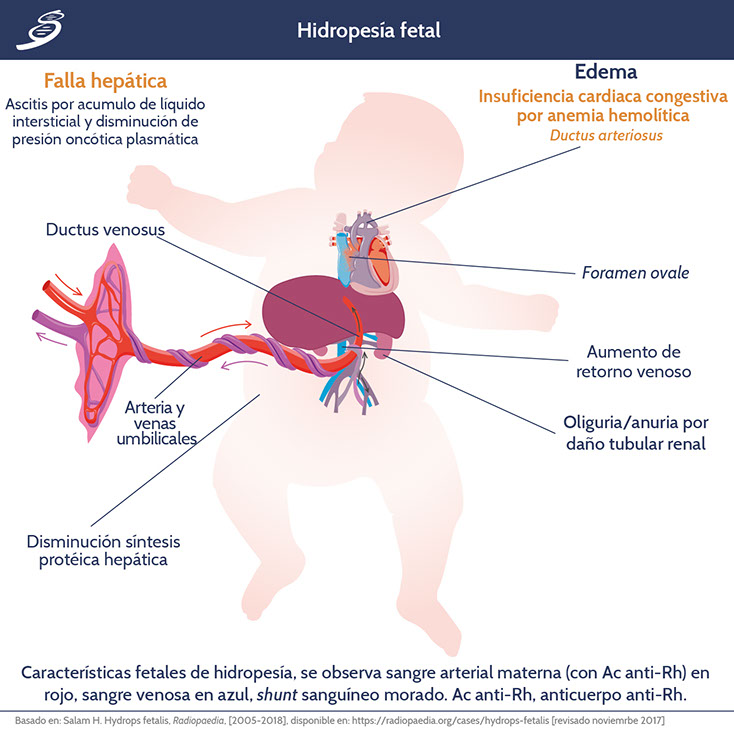 • La hipoxia crónica y falla hepática generan insuficiencia cardiaca provocando un aumento en la presión venosa, la cual aumenta el daño hepático y genera edema y ascitis hasta la hidropesía fetal (hydrops fetalis).