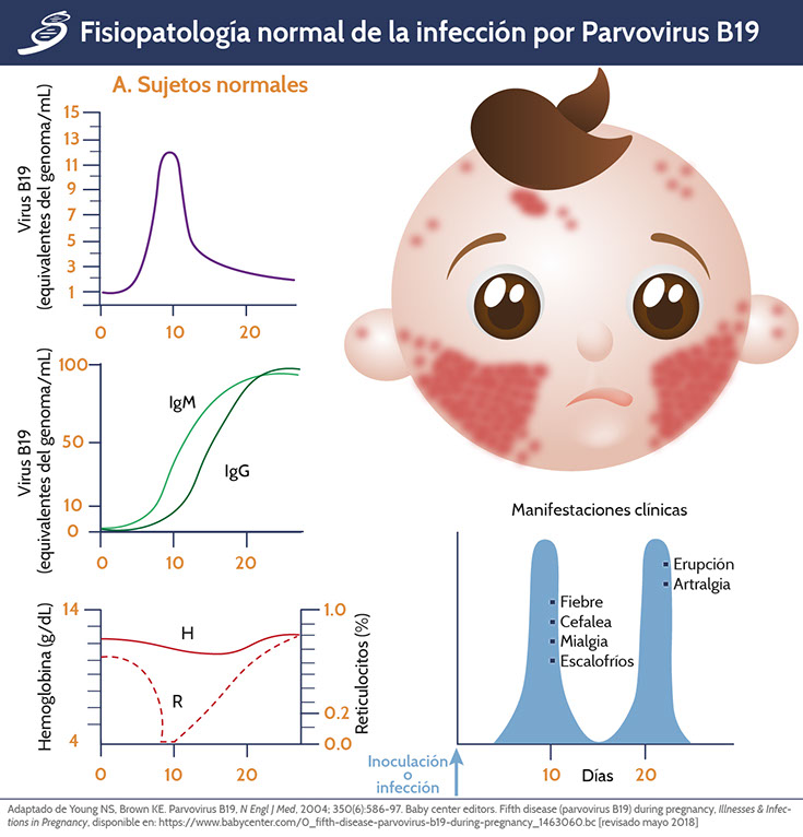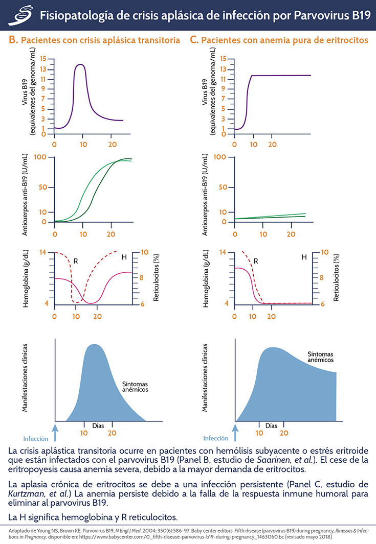 Existe un amplio espectro de síndromes clínicos que se han documentado para la infección de PvB19, el más conocido es el eritema infeccioso (la “quinta enfermedad exantemática de la infancia”), pero, además, en pacientes inmunocomprometidos se manifiesta como crisis aplásicas transitorias por infección persistente expresada como aplasia pura de eritrocitos y artritis. En niños con hemoglobinopatías o con anemia drepanocítica llega a haber un descenso en los niveles de hemoglobina de 2 a 6 g/dL (≤1 usualmente en niños sanos).
