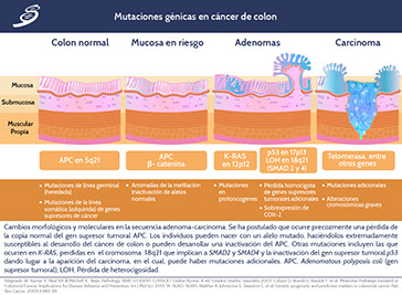 Dentro de la fisiopatología es importante conocer los elementos que la patogénesis molecular ha tomado en los últimos años, quedando más que demostrado que la progresión morfológica de la mucosa normal a adenoma, y de éste a tumor maligno, es debido a mutaciones del ADN. Para que el CCR aparezca se necesita una serie de mutaciones acumuladas en genes específicos conocidos como genes supresores tumorales, oncogenes y genes reparadores del ADN.