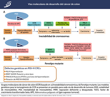 Los estudios moleculares de la CCR han dilucidado que varias vías de señalización están involucradas en su desarrollo. Ahora tenemos una idea bastante detallada de los principales eventos genéticos involucrados en la carcinogénesis colorrectal. La heterogeneidad morfológica, en términos de sitio, grado y tipo del tumor, se ha ampliado por complejidad molecular , identificándose vías moleculares que actúan en el desarrollo de la neoplasia, como se observa en la imagen siguiente.