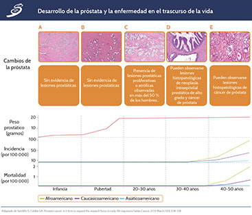 Ahora bien, de acuerdo a estudios realizados sobre las características de la próstata y los cambios que se presentan en ésta por la acción hormonal, pueden observarse cambios desde la infancia, presentándose cambios histológicos de importancia con mayor frecuencia entre los 40 y 50 años. En la siguiente imagen se puede apreciar el desarrollo de la próstata y su patología a lo largo de la vida del hombre.