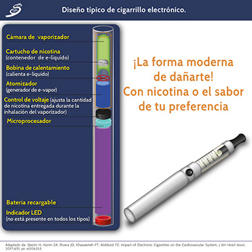 Los cigarrillos electrónicos (cigarrillo-e), también conocidos como e-cigars o vaporizadores, son sistemas electrónicos de entrega de nicotina que generan una mezcla aerosolizada que contiene líquidos aromatizados y nicotina que es inhalada por el usuario. Existe una gran variedad de cigarrillos-e con diversas concentraciones de nicotina presentes en líquidos, diferentes compuestos portadores, aditivos, sabores y voltaje de la batería con la cual funciona. Independientemente del diseño exacto, cada cigarrillo-e tiene un sistema de funcionamiento común que se compone de una batería de litio recargable, cámara de vaporización y un cartucho. En conjunto, existe diversidad en los diseños, pero esta variabilidad también complica la capacidad de evaluar las consecuencias para la salud. Esto no sólo aplica para los dispositivos que usan nicotina, actualmente se han analizado tanto los que usan nicotina como los que usan saborizantes y su impacto en la salud, recordemos que estos datos no pueden ser a largo plazo ya que tienen poco tiempo en el mercado, aunque las conclusiones son alarmantes, especialmente porque se piensa que no tienen un impacto negativo para el usuario.