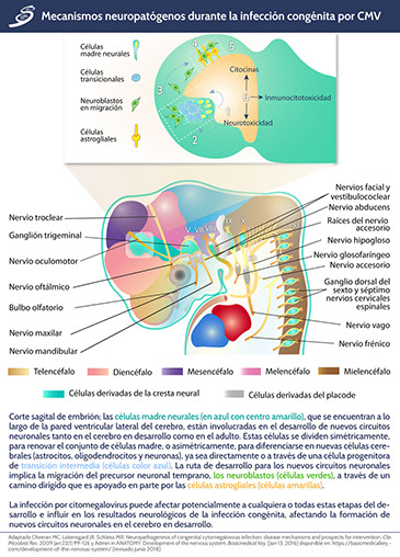 6. Finalmente, la infección por CMV induce una gran cantidad de mediadores inflamatorios, como citocinas, radicales oxidativos y otros productos químicos neurotóxicos; éstos pueden afectar a la neurona inmadura al inducir directamente citotoxicidad o pueden afectar la función neuronal al alterar el microambiente que altera la fisiología normal de las células cerebrales.