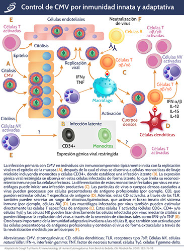 Crough T y Khanna R. Immunobiology of Human Cytomegalovirus: from Bench to Bedside, Clin Microbiol Rev, 2009; 22(1): 76–98.