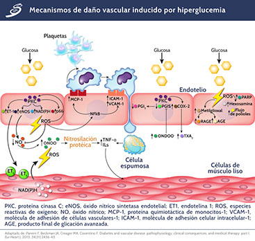Las altas concentraciones de glucosa intracelular conducen a la activación de la proteína cinasa C (PKC) y posterior producción de ROS por nicotinamida adenina dinucleótido fosfato (NADPH) oxidasa y la proteína adaptadora p66Shc. El aumento del estrés oxidativo inactiva rápidamente el NO que conduce a la formación del ONOO- pro-oxidante, responsable de la nitrosilación de proteínas. La disponibilidad reducida de NO también se debe a la disregulación de eNOS dependiente de PKC. De hecho, la PKC desencadena una regulación al alza de enzimas que mejoran el desacoplamiento de eNOS y conduce a una mayor acumulación de radicales libres. Por otro lado, la hiperglucemia reduce la actividad de eNOS que entorpece la fosforilación activadora en Ser1177. Junto con la falta de NO, la activación de PKC inducida por la glucosa provoca una síntesis aumentada de ET-1 que favorece la vasoconstricción y la agregación plaquetaria. La acumulación de anión superóxido también desencadena la regulación positiva de los genes proinflamatorios: proteína quimiotáctica de monocitos-1 (MCP-1), molécula de adhesión de células vasculares-1 (VCAM-1) y molécula de adhesión celular intracelular-1 (ICAM-1) a través de la activación de la señalización del factor nuclear kappa-beta (NF-kB). Estos eventos conducen a la adhesión de los monocitos, movimiento y diapédesis con la formación de células espumosas en la capa subendotelial. Las citocinas inflamatorias derivadas de células espumosas mantienen la inflamación vascular, así como la proliferación de células del músculo liso, acelerando el proceso aterosclerótico. La disfunción endotelial en la diabetes también se deriva del aumento de la síntesis de tromboxano A2 (TXA2) a través de la regulación positiva de cicloxigenasa 2 (COX-2) y la inactivación de prostaciclinas (PGI2) mediante una mayor nitrosilación. Además, las ROS aumentan la síntesis del metabolito de la glucosa metilglioxal, lo que conduce a la activación de la señalización de los productos finales de la glicación avanzada/receptor para productos finales de glicosilación avanzada (AGE/RAGE) y del flujo pro-oxidante de la hexosamina y la vía de los polioles (véase imagen previa).