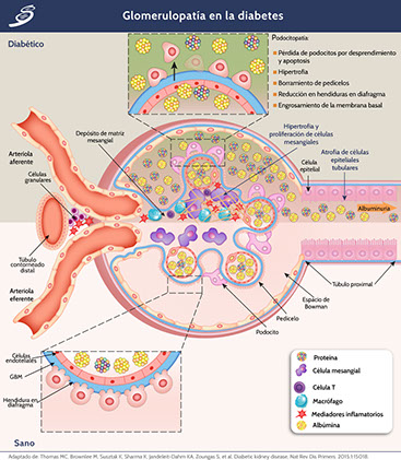 En el glomérulo suceden cambios tempranos que son críticos para el posterior desarrollo de la glomeruloesclerosis y la pérdida de la función de la nefrona. Entre estos cambios, el más importante podría ser la disfunción de los podocitos glomerulares, que son células diferenciadas terminales altamente especializadas que cubren el polo urinario de la membrana basal glomerular (GBM). Junto con las células endoteliales glomerulares, los podocitos son responsables del mantenimiento de la GBM, su barrera con carga y la forma e integridad del bucle del capilar glomerular; todas estas funciones están comprometidas en el glomérulo diabético. El medio diabético induce cambios "patopaptativos" en los podocitos, incluida la reorganización del citoesqueleto, la des-diferenciación, la apoptosis y la autofagia que se manifiesta por el ensanchamiento morfológico, la retracción y el aplanamiento (conocido como borramiento), la motilidad reducida, el aumento de la formación de uniones estrechas, una disminución en la longitud de la hendidura del diafragma, hipertrofia glomerular, desprendimiento y pérdida de los podocitos (como se observa en la siguiente imagen).