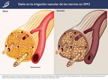 Tradicionalmente la vasculopatía asociada a DM se agrupa en dos subtipos principales; complicaciones microvasculares como retinopatía, nefropatía y neuropatía, y complicaciones macrovasculares aterotrombóticas como infarto al miocardio, enfermedad cerebrovascular y enfermedad arterial periférica. A continuación, se explican los mecanismos de daño de acuerdo a esta división.