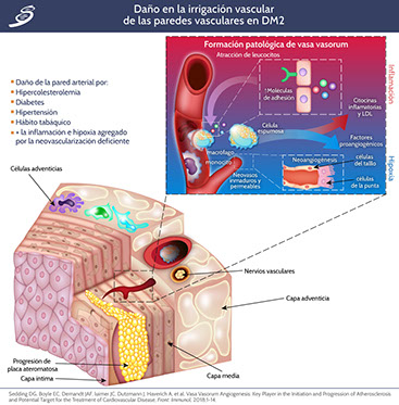 La proliferación de vasa vasorum se asocia con un aumento del daño a la placa que promueve la aterosclerosis. Muchos procesos celulares como la inflamación, la perfusión de placa y la hemorragia intraplaca concomitante son críticos durante el desarrollo de placas ateroscleróticas y están relacionados con la proliferación de vasa vasorum. La neovascularización se desarrolla por el crecimiento tanto de la capa adventicia (hacia afuera) como de la luz arterial (hacia adentro) hacia la íntima. En la DM2, la rotura de la placa se asocia con un aumento de la angiogénesis, acelerando la aterosclerosis aún más con la microangiopatía por neovasculatura. La respuesta angiogénica inicial en el vasa vasorum adventicial, es un componente importante de los mecanismos homeostáticos, parece ser estimulada por la hipoxia a través de la identificación de aumento del factor inducible por hipoxia y del VEGF. El VEGF también contribuye a las complicaciones microvasculares al aumentar la permeabilidad vascular a las macromoléculas, la quimiotaxis de monocitos y la producción de factor tisular. La regulación al alza de VEGF también se informa en modelos experimentales de enfermedad renal diabética. Sin embargo, contrariamente a esto, se ha demostrado que el tratamiento con VEGF restablece la microcirculación en la vasa nervorum y limita la neuropatía diabética. En el ojo, un factor derivado del epitelio pigmentario de factor neurotrópico (PEDF) puede compensar la acción de VEGF por su potente inhibición angiogénica. El nivel de PEDF disminuye en la retinopatía proliferativa, mientras que los niveles de VEGF aumentan. La disminución de los niveles de PEDF también pueden contribuir a la nefropatía diabética. Otros factores de crecimiento como el factor 1 de crecimiento de tipo insulínico, el factor de crecimiento de fibroblastos básico y el factor de crecimiento de hepatocitos pueden fomentar la retinopatía proliferativa.