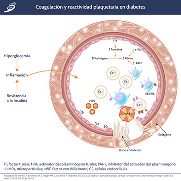 La hiperglucemia crónica y la resistencia a la insulina determinan una alteración significativa en los factores de coagulación, así como una mayor agregación plaquetaria, lo que lleva a un estado protrombótico. El aumento inducido por la diabetes de los niveles de factor tisular, activan la trombina convirtiendo el fibrinógeno en fibrina. La fibrina organizada aumenta aún más debido a altos niveles de PAI-1 y de t-PA reducidos. El aumento del contenido de Ca++, la estimulación de la trombina y la interacción con el factor de von Willebrand (vWF) a través del receptor de la glucoproteína IIb/IIIa, la cual provoca cambios en la forma de las plaquetas, la liberación de sus gránulos y la agregación. La liberación de micropartículas del endotelio lesionado y las plaquetas circulantes contribuyen a acelerar el desarrollo de un trombo. La disfunción endotelial precipita la ruptura de la capa endotelial y conduce a la exposición del colágeno y vWF, activando las plaquetas y favoreciendo la trombosis vascular.