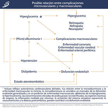 La estrecha asociación entre la nefropatía diabética y la retinopatía es quizás el ejemplo mejor conocido por los médicos; el llamado síndrome del pie-ojo de la diabetes es otro. También se reconoce una estrecha asociación entre la disfunción eréctil y el riesgo cardiovascular, un vínculo que se cree que está mediado por una disfunción endotelial generalizada. Dado que los eventos patológicos tempranos son muy similares en los vasos pequeños y grandes, se ha formulado la hipótesis de que los cambios dentro de la microcirculación pueden impulsar el desarrollo y la progresión de la enfermedad de grandes vasos (como se esquematiza en la siguiente imagen).
