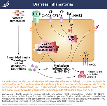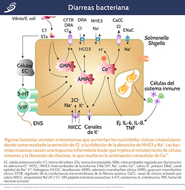 La secreción electrogénica es inducida por un aumento de la concentración intracelular de monofosfato de adenosina cíclico (cAMP), monofosfato de guanosina cíclico (cGMP) o calcio (Ca++) en respuesta a enterotoxinas microbianas y a restos endocrinos o no endocrinos endógenos que incluyen citocinas inflamatorias.