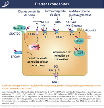 Otro mecanismo de diarrea secretora es la inhibición de la vía electroneutral acoplada a NaCl que involucra los intercambiadores sodio/hidrógeno (Na+/H+) y cloro/bicarbonato (Cl-/HCO3-). Los defectos en los genes de los intercambiadores Na+/H+ y Cl-/HCO3- son responsables de la diarrea congénita de Na+ y Cl-, respectivamente.