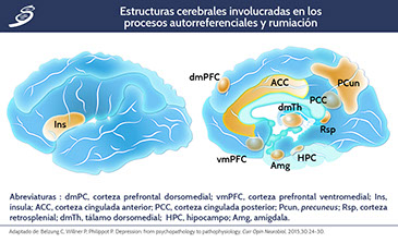 En los estudios estructurales y funcionales de neuroimagen, la red cerebral subyacente a la rumiación se sobrepone, durante los procesos autorreferenciales negativos, a la red neuronal reclutada (observar la imagen “Estructuras cerebrales que participan en procesos autorreferenciales y rumiación”). De hecho, la rumiación se ha asociado con una mayor actividad de la RND, incluidas las regiones que procesan el recuerdo emocional, como el hipocampo, pero también con la disminución de la actividad dentro de una red implicada en el proceso de inhibición de pensamientos no deseados. La última red incluye la circunvolución frontal inferior bilateral, el ACC y la corteza cingulada media. En pacientes deprimidos, los niveles de rumiación se correlacionan positivamente con la actividad en partes de este sistema, particularmente el vmPFC y el ventral ACC.