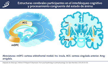 Otras evidencias han asociado el juicio emocional-congruente con áreas cerebrales adicionales incluyendo la amígdala, ínsula y la ACC, las cuales se encuentran disfuncionales en pacientes deprimidos, confirmando que la depresión está asociada con el funcionamiento alterado del sistema cerebral involucrado en el procesamiento congruente del estado de humor. En la siguiente imagen se aprecian las estructuras cerebrales involucradas en el mecanismo de interbloqueo cognitivo y procesamiento congruente del estado de ánimo.