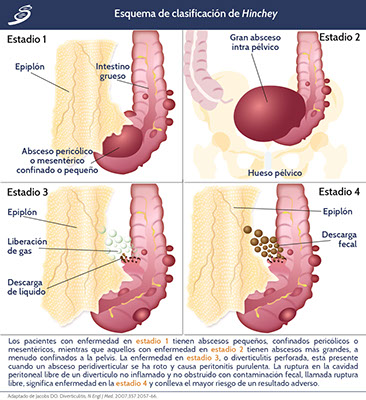 La clasificación de gravedad de la diverticulitis a menudo se clasifica con el uso de los Criterios de Hinchey (esquematizados en la siguiente imagen), aunque este sistema de clasificación no tiene en cuenta los efectos de las enfermedades coexistentes sobre la gravedad de la enfermedad o el resultado. El riesgo de muerte es inferior al 5% para la mayoría de los pacientes con diverticulitis en estadio 1 ó 2; aproximadamente 13% para aquellos con estadio 3, y 43% para aquellos con estadio 4.