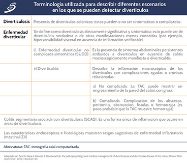 La enfermedad diverticular y sus complicaciones son una causa importante de morbimortalidad en todo el mundo y una carga para los sistemas de salud; es especialmente común en el mundo occidental. Es muy importante entender y diferenciar las definiciones de cada término a utilizar para que no se preste a la confusión. Los mismos se clasifican en la siguiente Tabla:
