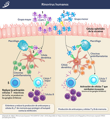 Los rinovirus infectan las células epiteliales del tracto respiratorio. Los virus se pueden agrupar según los receptores de células epiteliales a los que se unen. Los virus del grupo principal se unen al receptor de molécula de adhesión intercelular-1 (ICAM-1) de la superficie celular para la entrada (como se observa en la imagen paso 1); los virus de grupos minoritarios se unen al receptor de lipoproteínas de baja densidad (LDL) no relacionado (imagen paso 2). Esta diferencia de receptor resulta ser un factor clave en la forma en que estos virus interactúan con el sistema inmune. Los virus de grupo principal también se unen a la molécula de ICAM-1 expresada en macrófagos, células dendríticas y otras células inmunes (imagen paso 3). Esta unión desencadena una serie de cambios en las células inmunes que efectivamente amortigua la respuesta inmune. Las células inmunes producen señales antiinflamatorias (imagen paso 4); son más lentos para activar las células T en los ganglios linfáticos que atacan a los virus (imagen paso 5) y reducen la producción de anticuerpos y la activación de las células B y T de memoria que protegen al huésped contra la reinfección (imagen paso 6). Debido a que los virus de grupos menores no pueden unir la molécula de ICAM-1 a las células inmunes, no suprimen el sistema inmune.