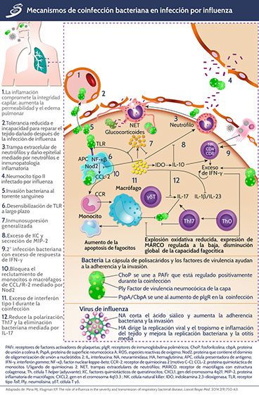Los virus de influenza y las bacterias respiratorias entran, infectan o colonizan las células del tracto respiratorio superior. El aumento de la adherencia bacteriana después de la infección por influenza es el resultado de un mayor número de receptores de factores activadores de plaquetas (PAFr) y receptores de inmunoglobulina poliméricos (plgR), división de neuraminidasa vírica de ácidos siálicos y denudación epitelial que expone los componentes de la membrana basal; cada uno permite una unión potenciada por factores de adherencia bacterianos (p. ej., fosforilcolina [ChoP], proteína de unión a colina A [cbpA] y proteína de superficie neumocócica A [PspA]) con una mayor replicación y transporte bacterianos. La inflamación inducida por virus mejora la expresión de factores de virulencia bacteriana (por ejemplo, neumolisina) y aumenta la liberación de biofilms bacterianos en el tracto respiratorio superior a un estado planctónico, que a su vez aumenta la diseminación bacteriana al tracto respiratorio inferior. La infección primaria de influenza, seguida de una inoculación bacteriana secundaria, causa una producción excesiva de citocinas y quimiocinas con numerosas consecuencias posteriores. El exceso de secreción de interferón tipo I produce un reclutamiento sobreabundante de neutrófilos inmaduros y maduros, lo que conduce a una inmunopatología grave, particularmente debido a la secreción de especies reactivas de oxígeno (ROS) por los neutrófilos y al desarrollo de trampas extracelulares de neutrófilos, que aumenta aún más la respuesta inflamatoria. Hay un exceso de interferones tipo I y II que reducen el reclutamiento de monocitos o macrófagos atenuando la señalización de la proteína que contiene el dominio de oligomerización de unión a nucleótidos 2 (Nod2) y potenciando la secreción de interleucina (IL)-10 antiinflamatoria, lo que también podría aumentar la producción de interferones tipo II, con una función reducida de macrófagos y un aumento de la apoptosis. El exceso de inflamación se ve exacerbado por la secreción reducida de anfiregulina mediada por virus y otros factores importantes para la regeneración tisular, que se suma a la integridad alveolar y endotelial reducida y conduce a fuga capilar, edema pulmonar e invasión bacteriana del torrente sanguíneo. La tormenta de citocinas o el sobrecrecimiento bacteriano a menudo provocan daños irreparables en el tracto respiratorio inferior y los sacos alveolares, lo que ocasiona neumonía grave, sepsis y, con frecuencia, la muerte.