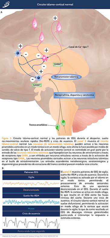 En la Figura anterior inciso B se ejemplifica en EEG cómo, durante la vigilia, la corteza es activada por el tálamo en modo tónico que permite el procesamiento de entradas sensoriales externas, esto da una apariencia desincronizada en el EEG. Durante el sueño No-REM, la corteza se activa en modo ráfaga, lo que resulta en el EEG como los husos rítmicos del sueño. Durante una crisis de ausencia, el circuito tálamo-cortical normal se vuelve disfuncional, permitiendo la activación en modo ráfaga de la corteza que ocurre durante la vigilia, lo que da como resultado un EEG de descargas rítmicas generalizadas punta-onda e interrumpe la respuesta a estímulos externos.