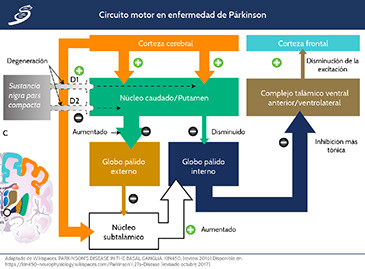Es así como en la enfermedad de Párkinson las alteraciones motoras son consecuencia de la alteración de las vías directa e indirecta de los ganglios basales por la disminución crónica de dopamina, y, como resultado, el tálamo se mantiene en un estado excesivamente inhibido.