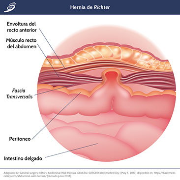 La hernia de Richter es una entidad engañosa con una mortalidad del 17% que se puede reducir mediante un diagnóstico preciso y una cirugía temprana. Deben evitarse los intentos de reducción manual antes de la inspección directa y la evaluación de la viabilidad del intestino. Por lo general, es necesaria una laparotomía porque el intestino se adhiere tan intensamente al anillo inguinal que la movilización desde el abordaje inguinal es imposible. En comparación con otras hernias se asocia con una mayor tasa de resección intestinal, duración de estancia hospitalaria, morbilidad y mortalidad.