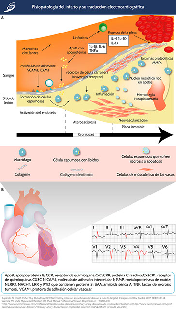 Las células endoteliales, los linfocitos, las células de músculo liso, los monocitos y los macrófagos están todos implicados en la patogénesis de aterosclerosis, desde la formación de células espumosas, inicialmente, hasta el desarrollo de placas avanzadas. La activación inicial es secundaria a lesiones tisulares y exposición del endotelio, produciendo y facilitando la deposición de lípidos en el espacio subendotelial; también, promueve el reclutamiento de monocitos circulantes donde se diferencian terminalmente en macrófagos, o se diferencian y proliferan localmente en distintos fenotipos funcionales. Los macrófagos activados absorben los lípidos, lo que da lugar a su transformación en células espumosas. A medida que la población de células espumosas crece dentro de las lesiones de la pared arterial, la velocidad de acumulación supera la velocidad de aclaramiento y, eventualmente, las células espumosas se unen en un núcleo necrótico rico en lípidos (Fisiopatología del infarto lado A).