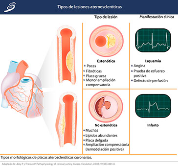 Las lesiones estenóticas presentan una cresta lipídica más pequeña, más fibrosis y calcificación, tapones fibrosos gruesos y menos ampliación compensatoria arterial (remodelación positiva) (lado a). Típicamente producen isquemia que puede ser controlada por medio de terapia médica combinada y, si fuera necesario, revascularización coronaria.