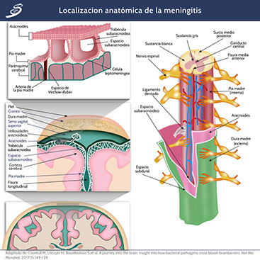 El sitio anatómico de la invasión bacteriana del torrente sanguíneo permanece sin identificar, no obstante, la evidencia experimental sugiere que el plexo coroideo puede ser un sitio de invasión, además del espacio, que es el sitio principal donde se desarrolla la infección. En el esquema siguiente, se pueden observar todas las estructuras que conforman la anatomía de cráneo y meninges, señalándose el espacio subaracnoideo, sitio principal de la meningitis.