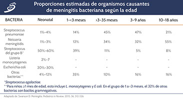 La meningitis bacteriana aguda tiene un inicio de síntomas relativamente rápido, y las técnicas de laboratorio de rutina pueden identificar al patógeno. Las causas más comunes han sido Streptococcus pneumoniae, Neisseria meningitidis, Haemophilus influenzae tipo b (Hib), Streptococcus del grupo B (GBS) y Listeria monocytogenes. Es importante tener en cuenta que las medidas preventivas juegan un papel importante para la disminución de casos de meningitis bacteriana de distintos agentes bacterianos, por ejemplo, la implementación de la vacuna conjugada neumocócica heptavalente (PCV7), en el año 2000, dio como resultado una reducción del 59% en las tasas de neumococomenitis en niños menores de dos años de edad. En la siguiente tabla se pueden observar las proporciones estimadas de organismos causantes de meningitis bacteriana según el grupo de edad.
