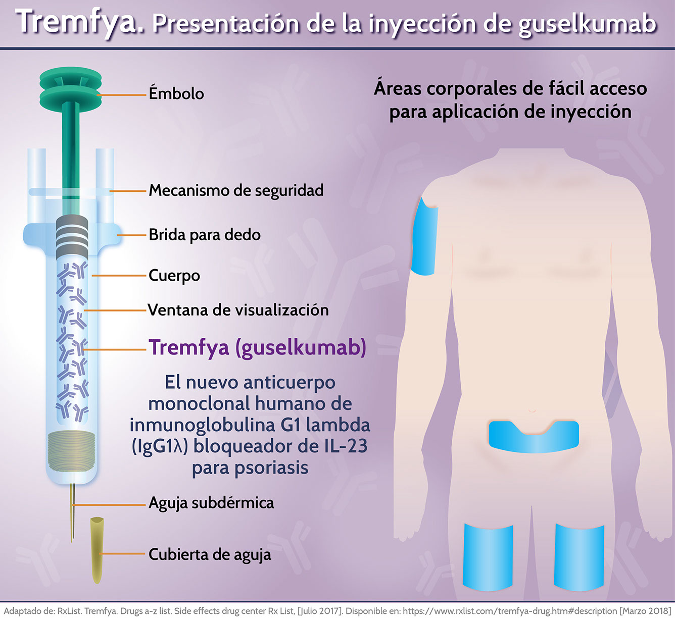 En julio de 2017, la Administración de Alimentos y Medicamentos (FDA, por sus siglas en inglés) aprueba el tratamiento innovador para la psoriasis llamado Tremfya (guselkumab) del laboratorio Janssen Biotech; gracias a sus resultados trascendentes en pacientes con psoriasis, esta compañía anunció que dicha terapia está aprobada para pacientes adultos con este padecimiento en placas de moderada a grave que son candidatos para terapia sistémica o fototerapia. Guselkumab es el primer biológico que bloquea selectivamente la interleucina (IL) -23, el cual es un impulsor clave de la respuesta inmune inflamatoria en la psoriasis.