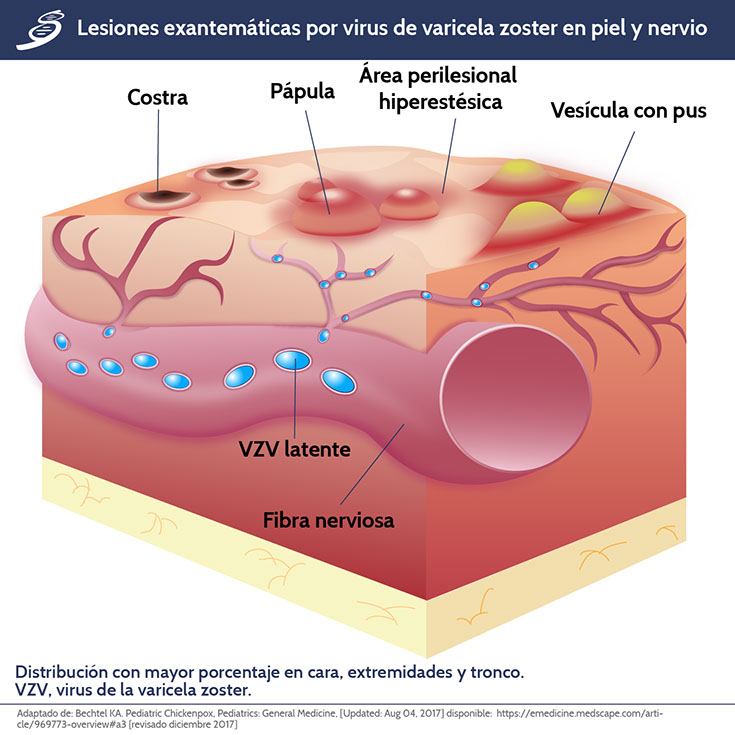 La varicela es una infección primaria causada por el virus de varicela zoster (VZV), el cual es perteneciente a la familia herpesviridae, subfamilia alfaherpesvirinae, que infecta exclusivamente a los humanos. Más del 90% de los adultos adquirió la enfermedad primaria en la infancia (varicela) ya que es altamente infecciosa por contacto directo con una lesión cutánea o por vía aérea al inhalarlo. Después de adquirir la infección inicial, el VZV se establece de una forma latente vitalicia en los ganglios de la raíz dorsal y ganglios craneales, por lo que puede reactivarse años después como infección por herpes zoster.